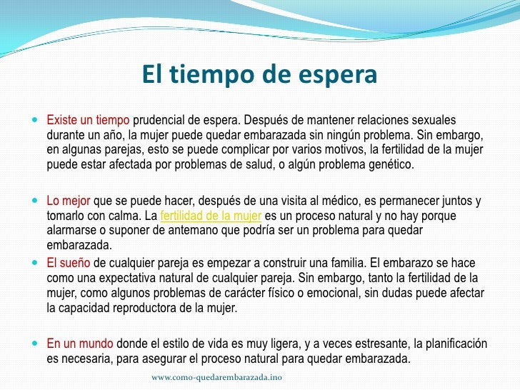 El riesgo de quedar embarazada, aún cuando no se eyacule dentro de la vagina aumentan cuando la mujer mantiene relaciones sexuales durante sus días fértiles, dado que el óvulo se encuentra. 8 dic 2016 uno de los problemas más frecuentes que enfrentan muchas parejas es la infertilidad, que se puede dar tanto en la mujer como en el hombre.